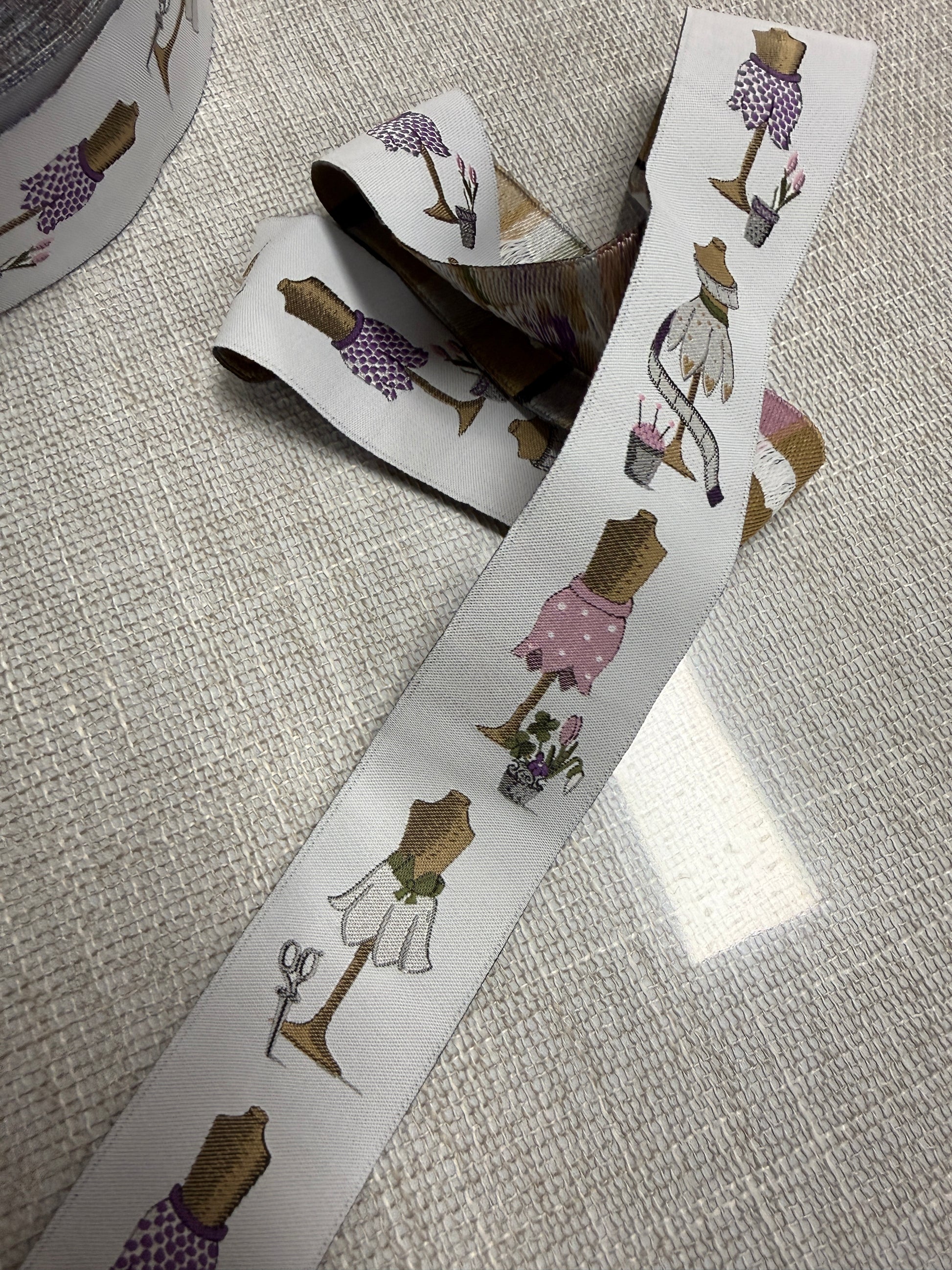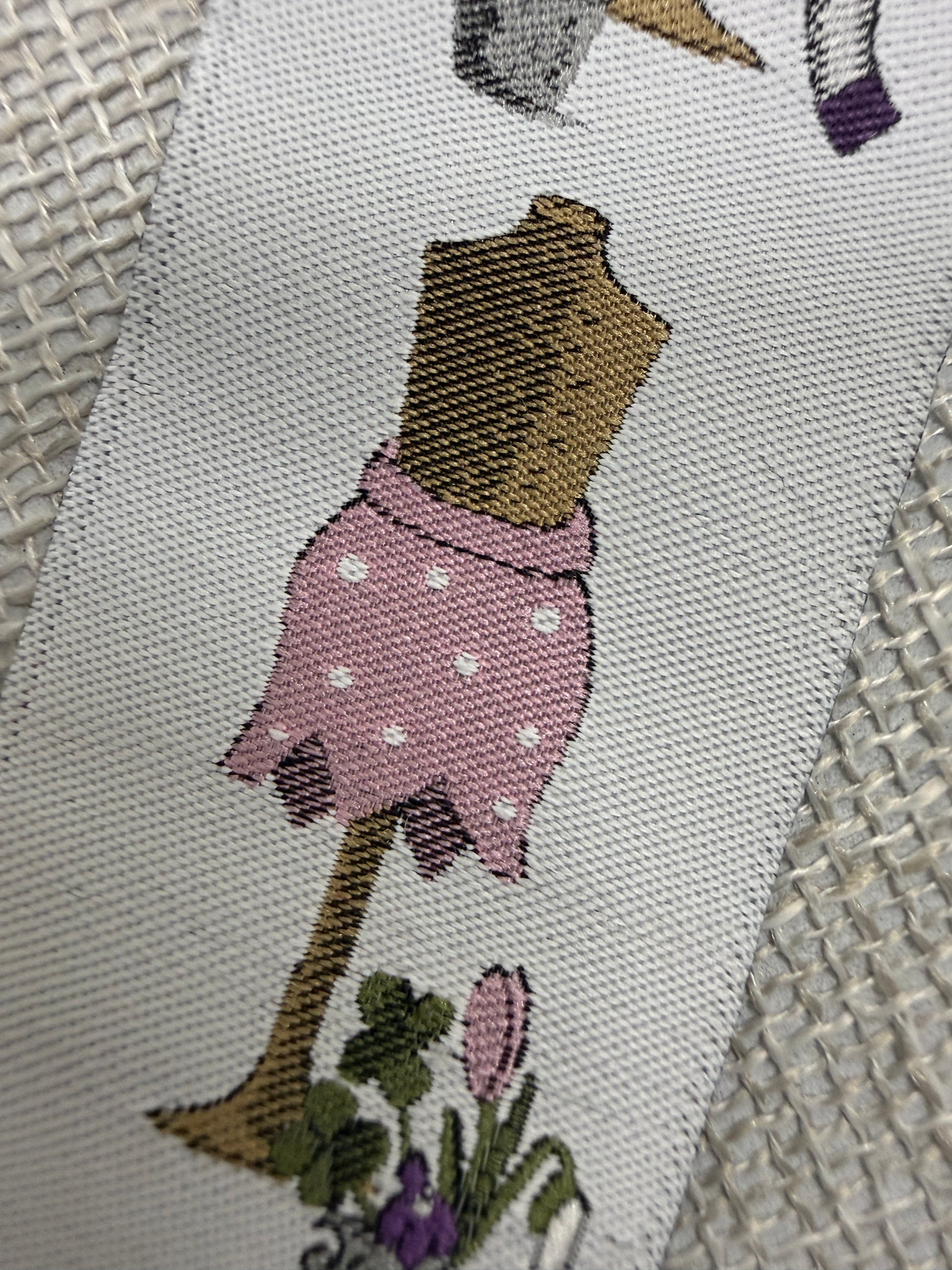 Acufactum fabric designs this woven ribbon from Acufactum depicts the "home sweet home" motifs.