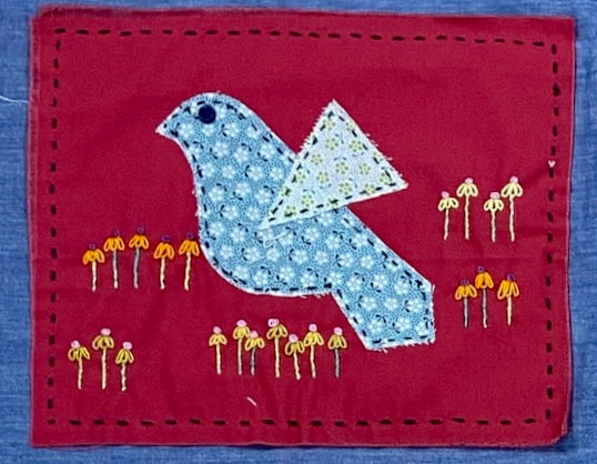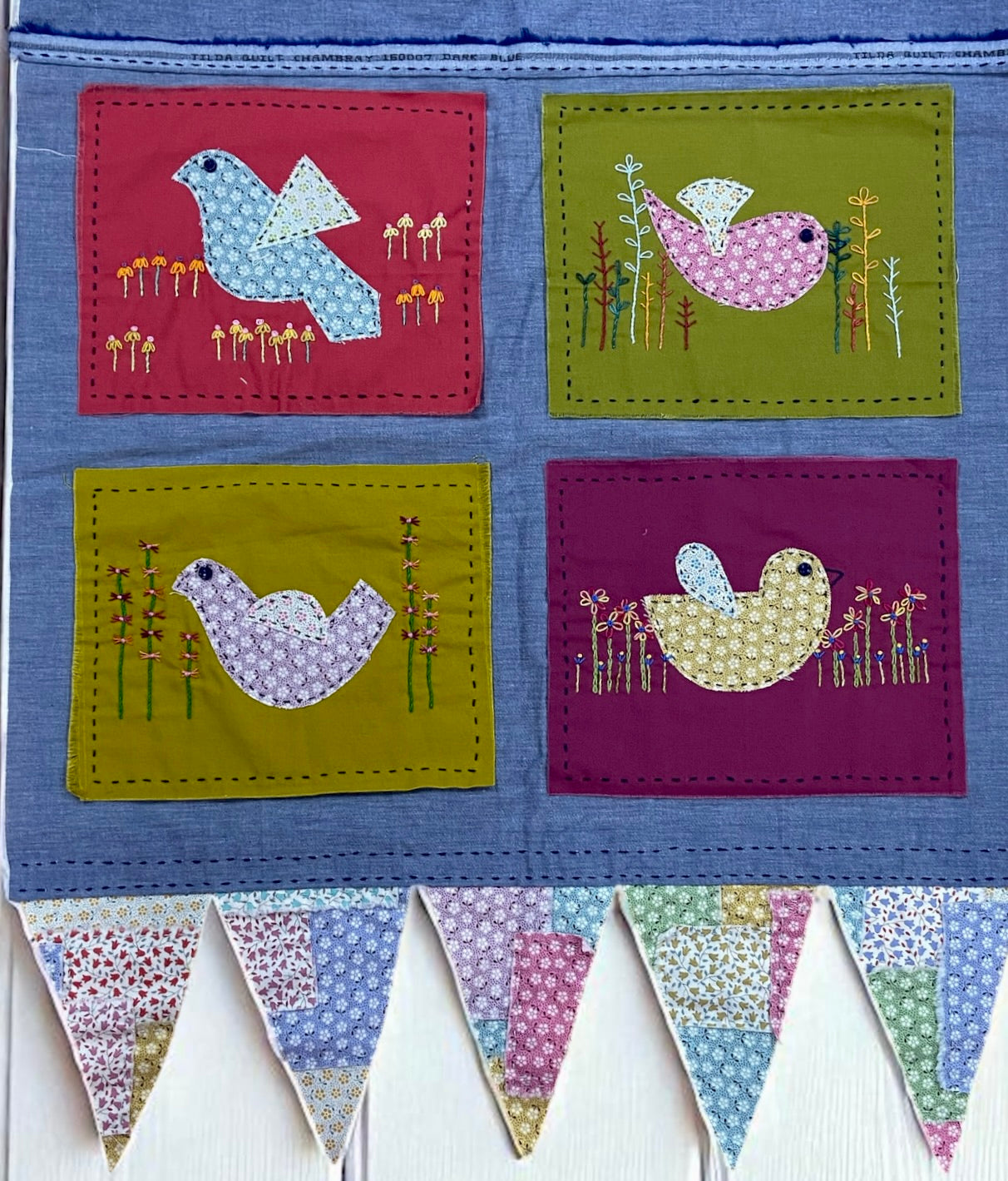 You'll learn the embroidery stitches, how to make the Alfred birds using templates, and the slow stitched bunting along the bottom.