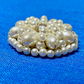 Round metal disc with pearl and crystal embellishments that have been wired in place.