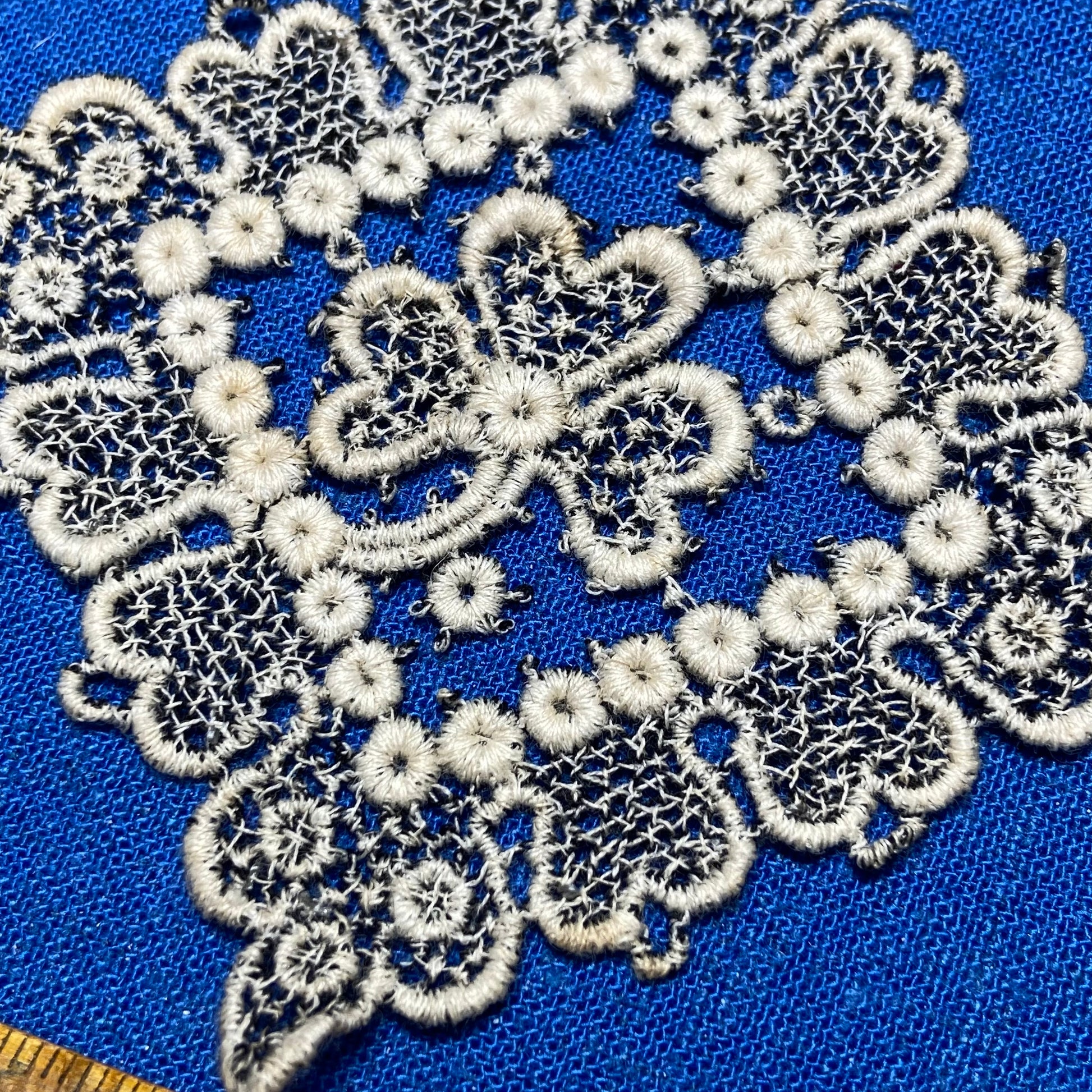 These two squares are still joined. They are machine made lace with a dark grey and white thread.