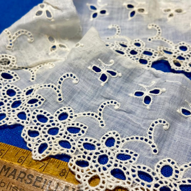 Reclaimed from a garment this broderie anglaise is soft and time worn.