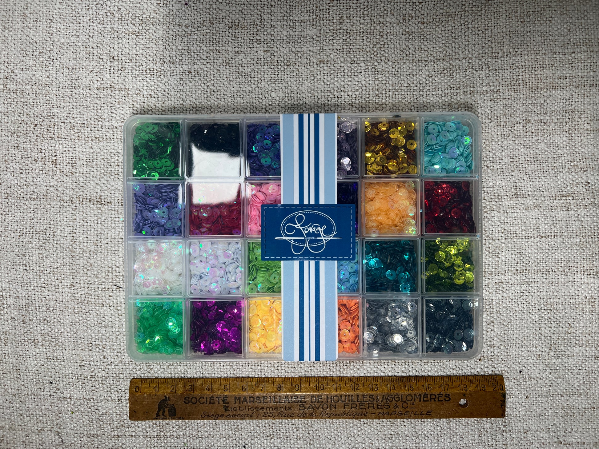 This box contains 24 different coloured sequins in a handy carry container. They're perfect for adding a bit of bling to your projects - each compartment is 3cm square so there's plenty of each colour to work with.