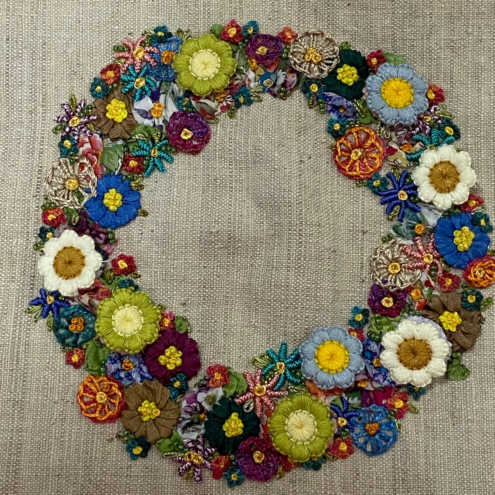 The Summer Wreath design includes simple embroidery stitches, pretty pre-made flowers and beads, clustered together to make a one of a kind project.